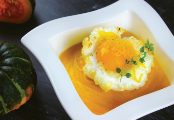 - 완성된 밤호박 스프를 그릇에 담고, 준비한 삶은 달걀 또는 포치드 달걀을 위에 올립니다.